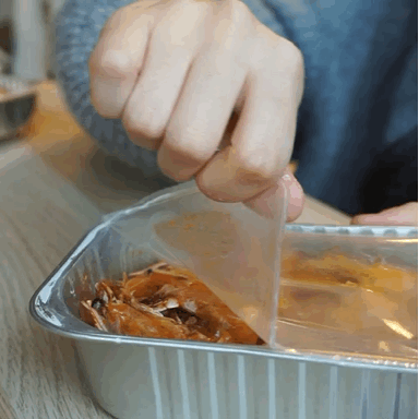 ding~漫長的十分鐘終于過去了,撕開包裝盒,水蒸氣里凝結(jié)著醬汁,一股子麻辣鮮香撲面而來。